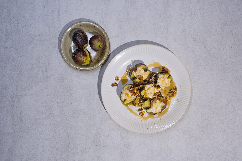 8–10 fresh ripe figs, ½ cup ricotta cheese, zest of 1 orange, 1–2 tsp fresh orange juice, ¼ cup toasted pecans, finely chopped, 2–3 tsp maple syrup plus extra for drizzling, 1 pinch cinnamon or nutmeg (optional), fresh mint leaves for garnish (optional), and sea salt flakes for finishing (optional).