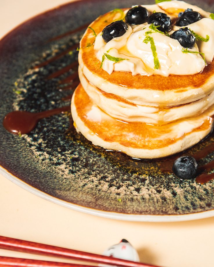Soufflé pancake, whipped cream, maple syrup, blueberry