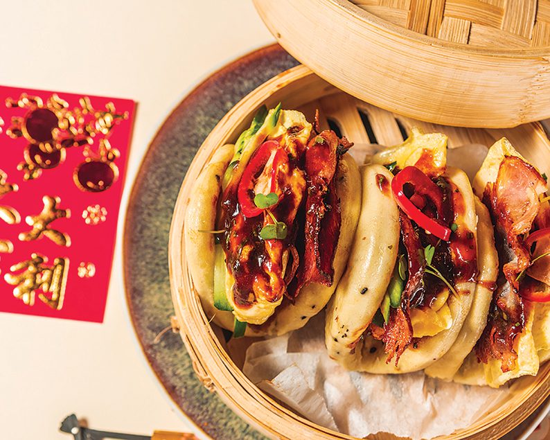 Gua Bao Buns, crispy bacon, fried egg, hoisin sauce